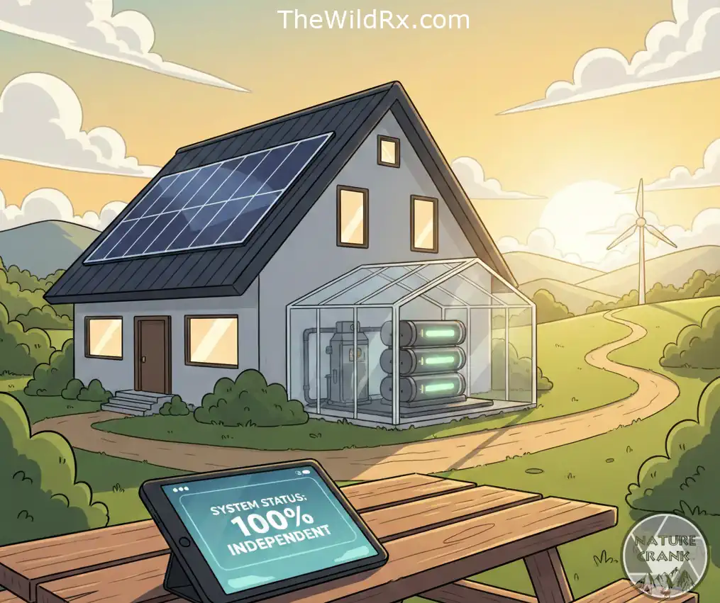 A modern off-grid home with solar panels and battery storage in 2026, representing energy independence and legal compliance.